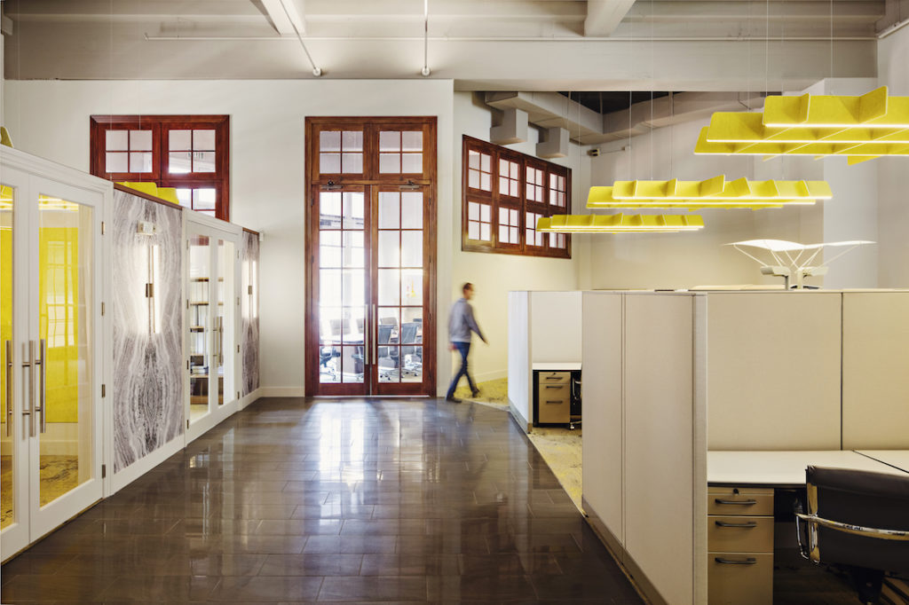 The BuzziGrid is a sound buffer that limits echo in a room. It takes its inspiration from the structures that have been widely used in the 60s and 70s to partially hide ceilings in public spaces. In this case the grid has been turned into a functional sound absorbing product that can be used in meeting rooms, lobbies, or other public spaces to define areas.