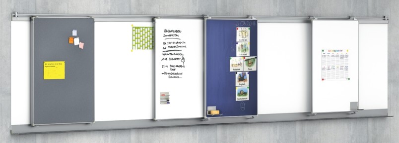 Board areas. Sturdy, lightweight design with anodized aluminum edging and rounded safety corners. Aluminum safety hanging fittings with integrated plastic glide elements or aluminum roller glide elements and unhinging retainer at the top. Aluminum-colored plastic spacer wheels at the bottom.