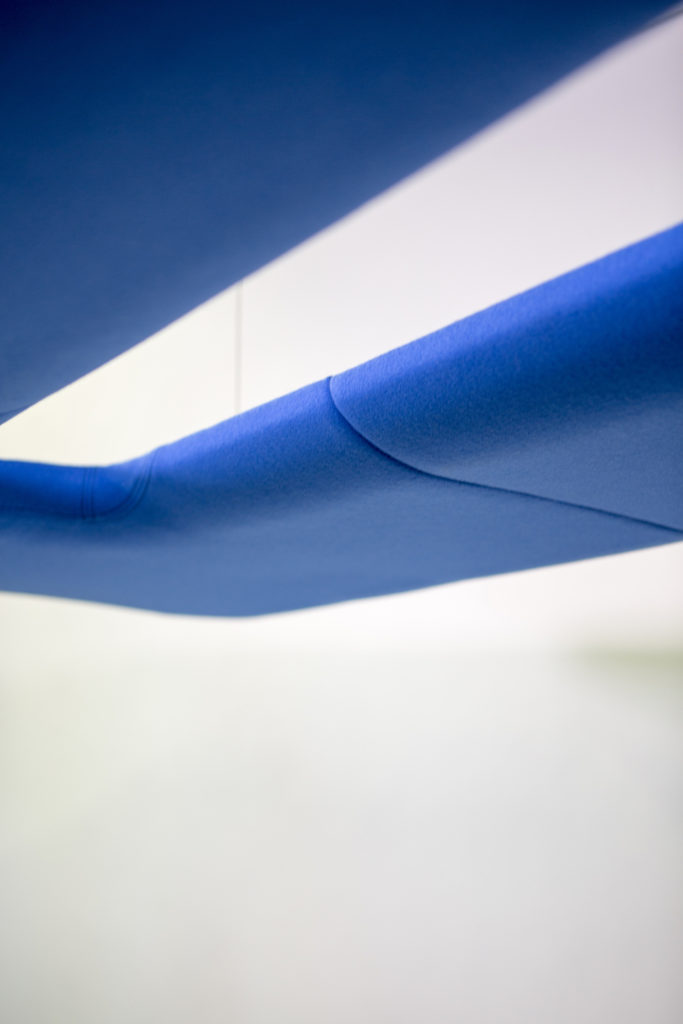 BuzziZepp is an impressive, sound absorbing panel offering acoustic treatment to a space. The suspended design was conceived by designer Alain Gilles as an “imaginary island” to visually delineate and bring a sense of tranquility to large open spaces. With its striking linear design, BuzziZepp hovers from above to define zones without obstruction, establishing a more intimate, quiet and purposeful sense of space—no vertical partitions or walls needed! The slim framework is made of upholstered acoustic panels, engineered to absorb sound and reduce echo.