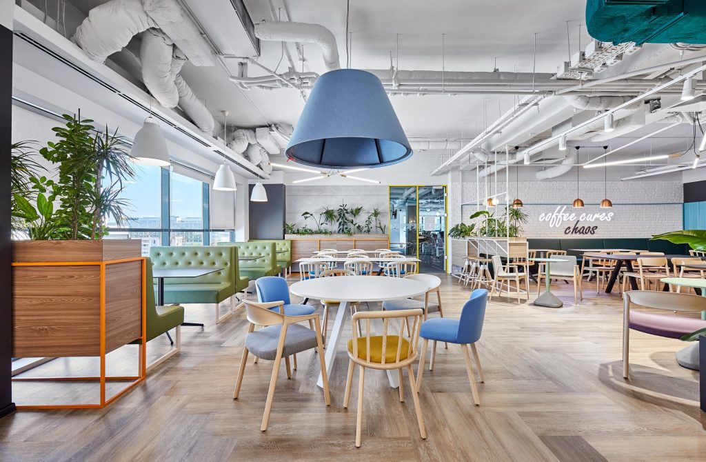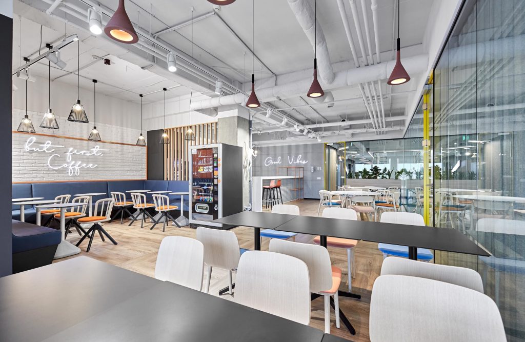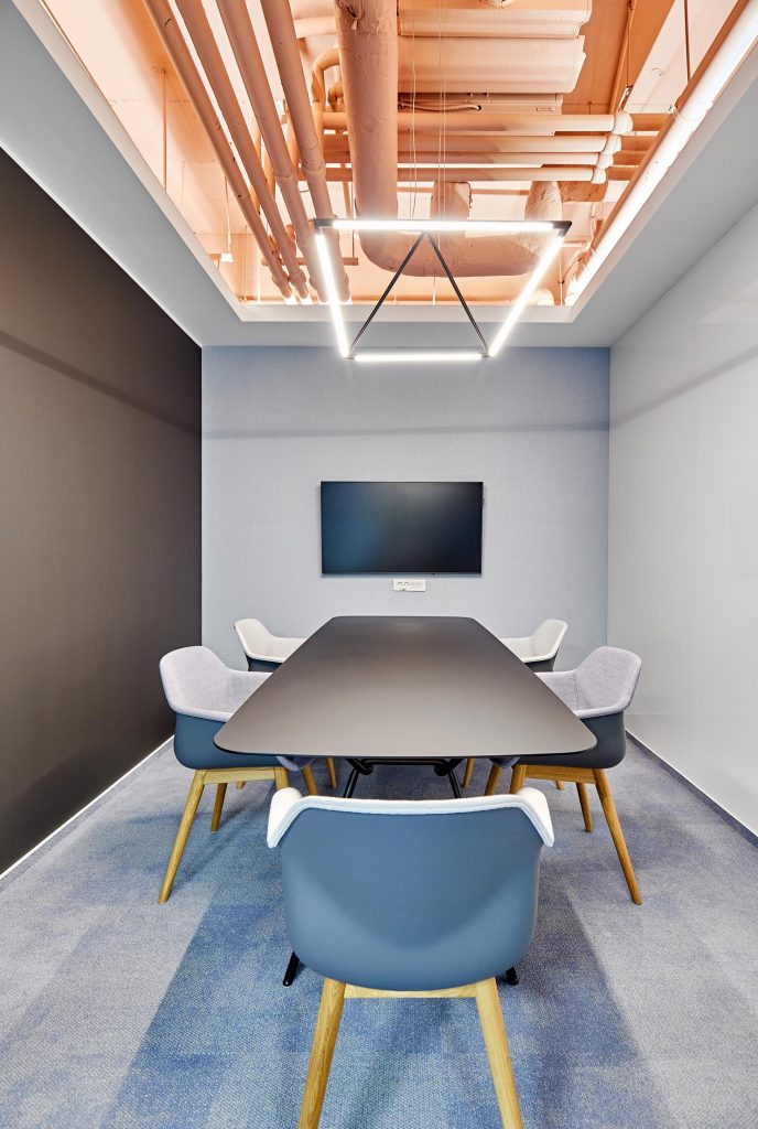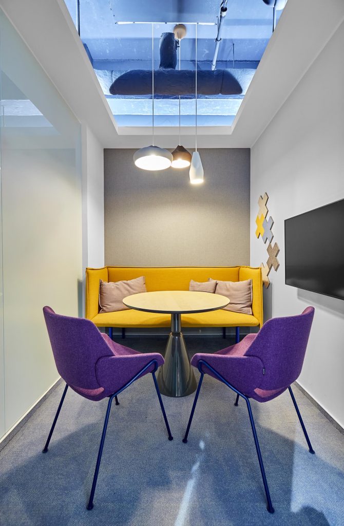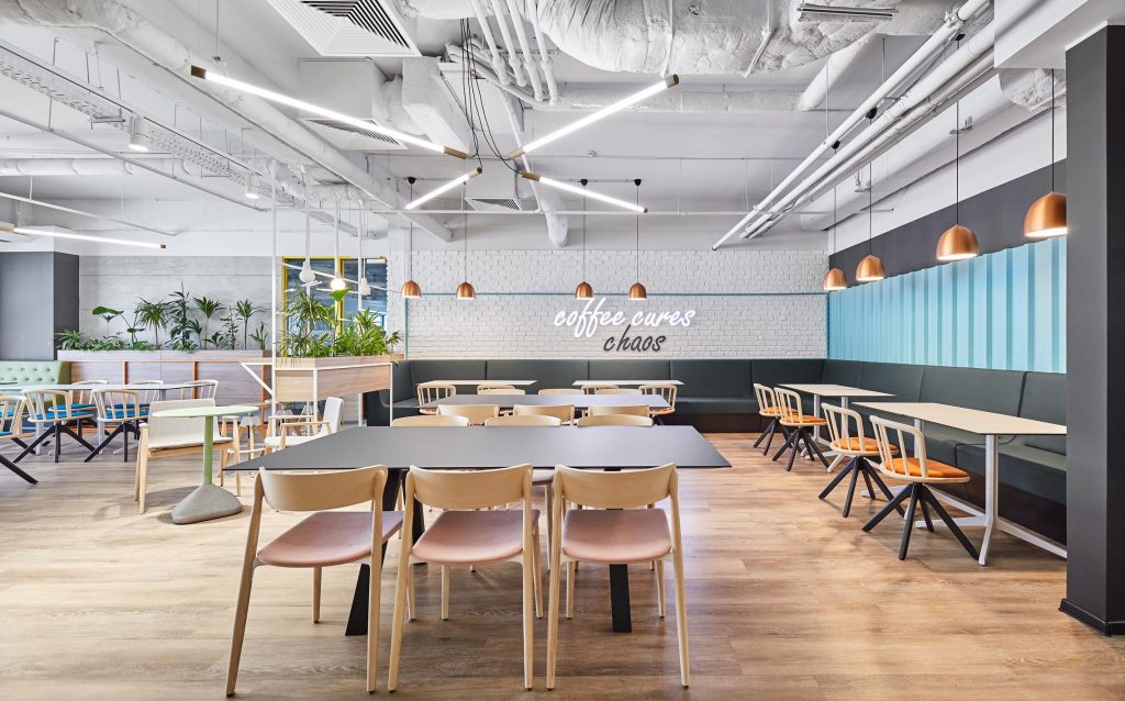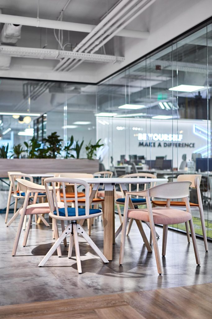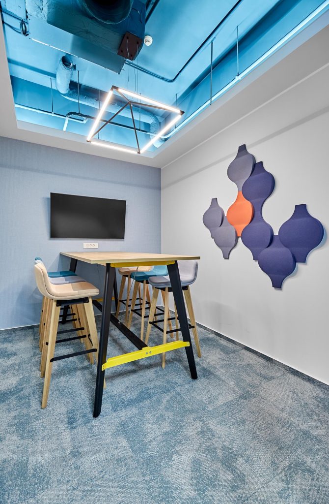 Conventional spaces thus acquire different values: the cafeteria becomes, in addition to a dining area, a space for socializing, working and relaxing; the meeting rooms, through the diversified furniture, offer the framework for different meeting scenarios, both formal and informal, creating, at the same time, the perfect environment for relaxation or focused work; the point of discussion area takes the form of a space dedicated to presentations with clients, as well as other activities such as internal presentations or brainstorming.
