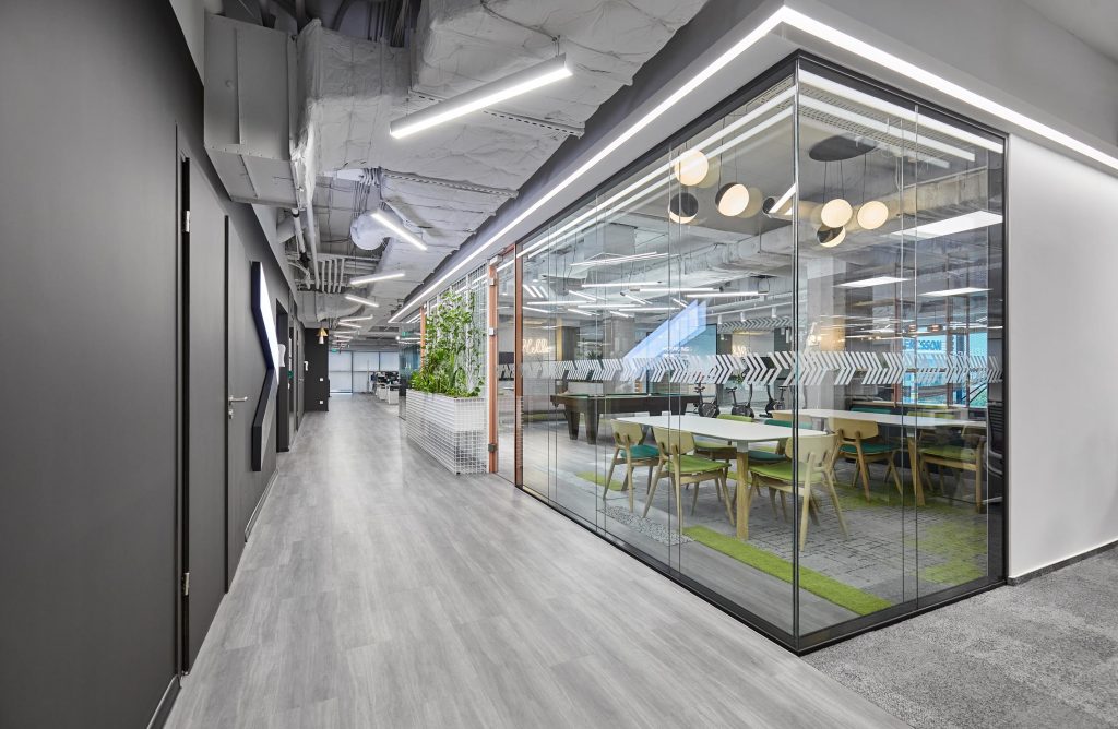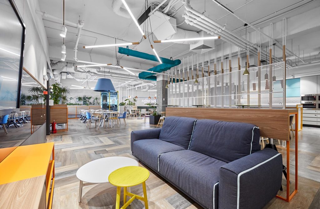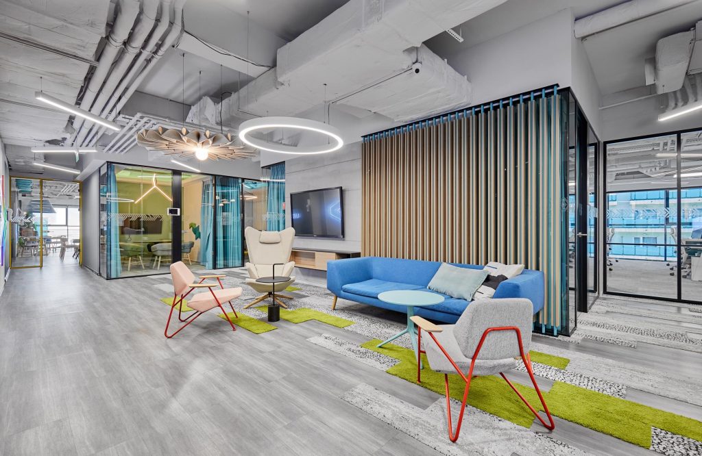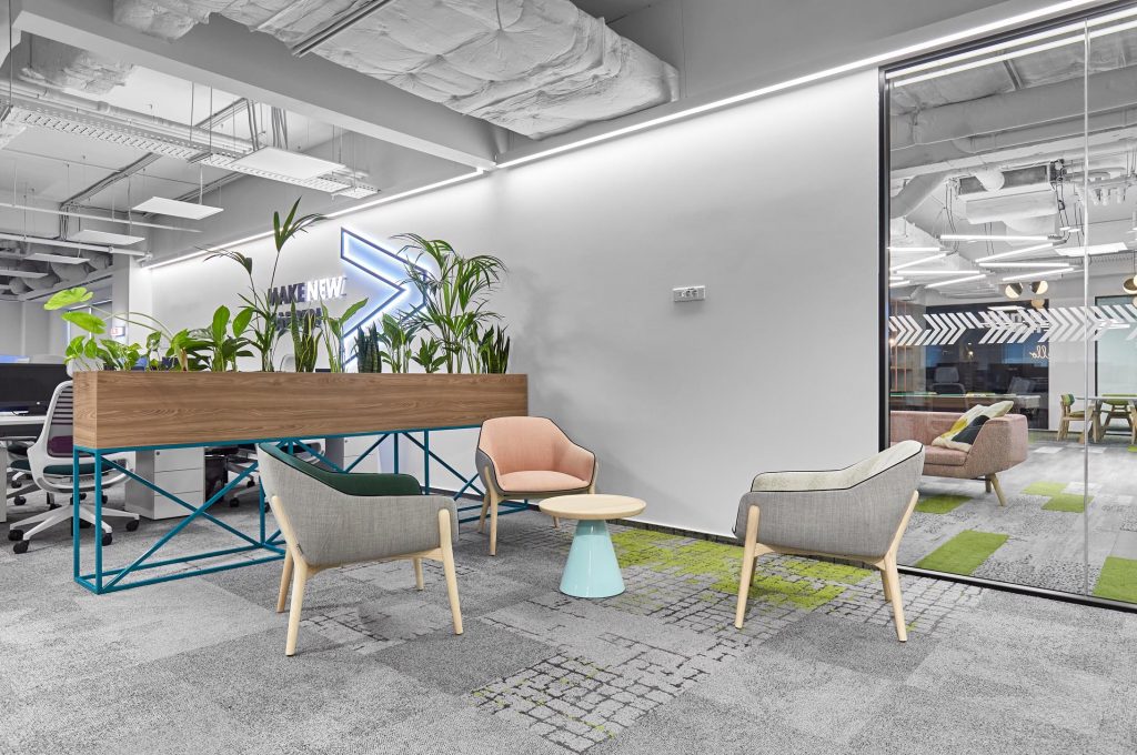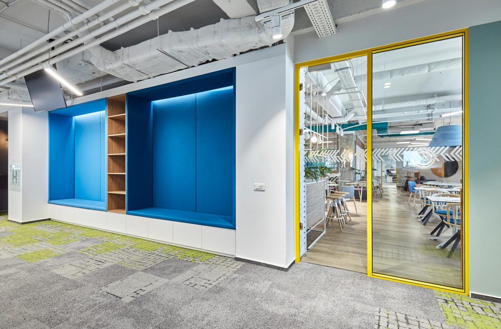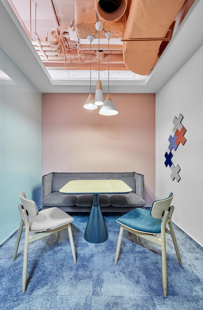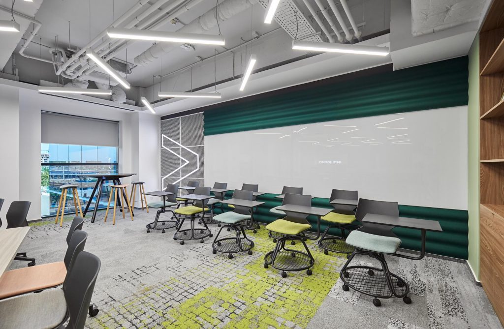 Conventional spaces thus acquire different values: the cafeteria becomes, in addition to a dining area, a space for socializing, working and relaxing; the meeting rooms, through the diversified furniture, offer the framework for different meeting scenarios, both formal and informal, creating, at the same time, the perfect environment for relaxation or focused work; the point of discussion area takes the form of a space dedicated to presentations with clients, as well as other activities such as internal presentations or brainstorming.